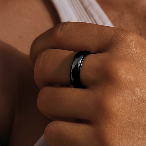 This striking rotating stainless steel ring is pleasing to spin and stare.
